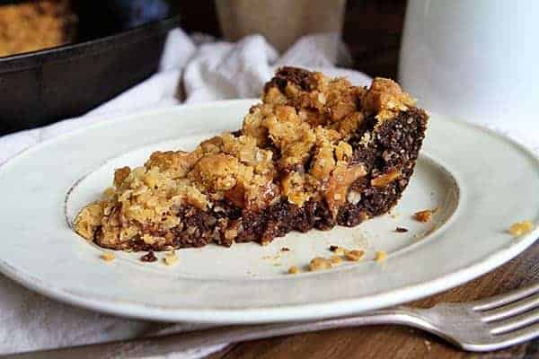 Brownie Carmelitas in a Skillet is layered bars with oatmeal crumble surrounding a center full of caramel sauce and chocolate. For another treat baked in a skillet, try my Peanut Butter Brownie Carmelitas.