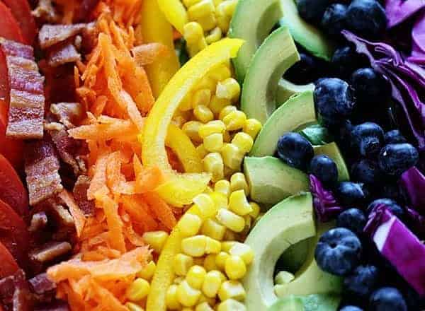 - Place shredded lettuce in a large bowl or serving platter. Add all vegetables, chopped bacon, and chicken on top of lettuce. (See the video to create a rainbow salad pattern.)