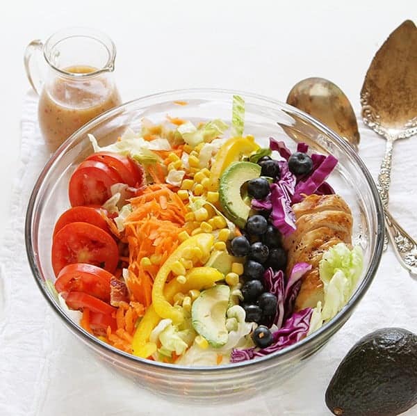 This Grilled Chicken Cobb Salad is made even more magical by the beautiful rainbow pattern! Not only will your kids oooh and aah over how beautiful it is, but they will actually get excited about eating it! I have to admit, it is one of my favorite salads to make for friends and family too! Be sure to check out my more traditional Delux Cobb Salad. (I love this salad with Homemade Ranch Dressing too!) Or, for a spicy kick on the traditional, try my Chipotle Chicken Cobb Salad!
