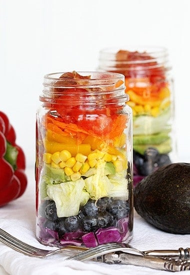 Of course, if you want to really have fun with your food, put it all in a jar! Not only is this beautiful, but convenient. (You may want to chop your ingredients a bit finer.) Place it all in a jar then head out for a picnic with your family! I love that this is also a great meal-prep option and that you can assemble it ahead of time.