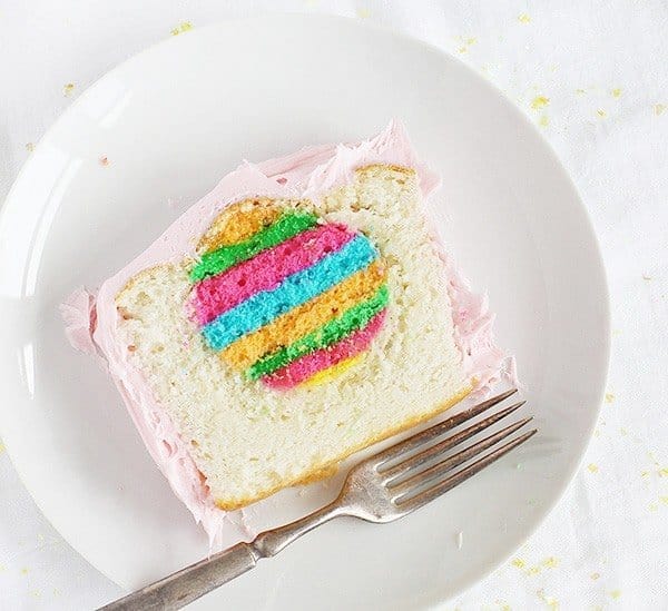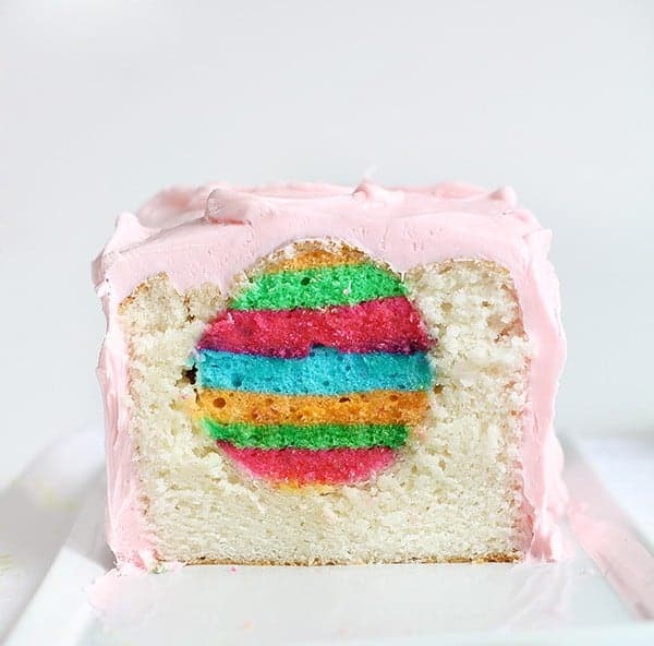 Well, hello! There’s a rainbow Easter egg in the center. This is just too dang cute. I want to lick that swishy pink frosting right off of that cake. Pinned.