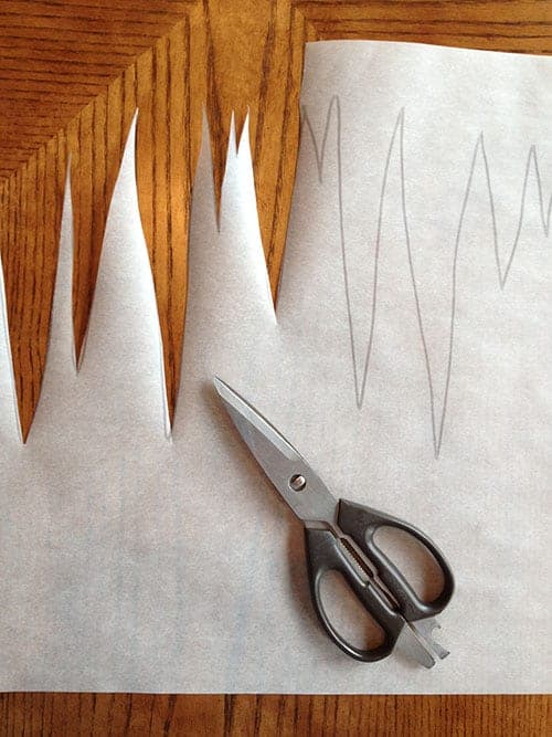 Lay parchment flat on table and start making icicle shapes pointing down. There is no right or wrong, but I found that the more icicles the better.
