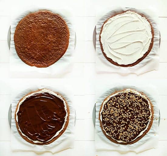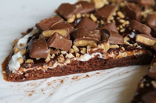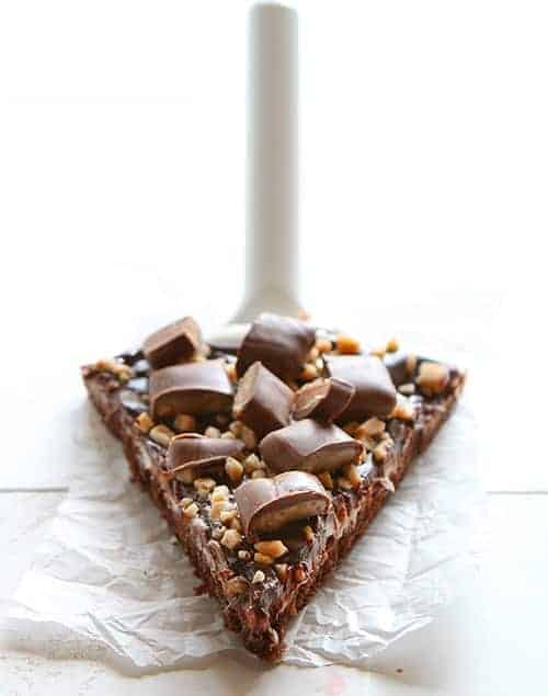 I used my Homemade Brownie Mix recipe for the brownies. ย It makes a smaller batch, so is perfect for this recipe as it just perfectly covers a 12-inch round pizza pan. ย Bake the brownies for about 18-22 minutes, or until an inserted toothpick is removed clean.
