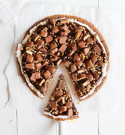 The Heath chips were purchased as were the candy bars. ย I did chop the mini Heath bars in half and then sprinkled on top of the pizza.
