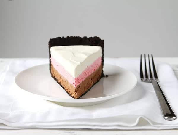 Neapolitan Cheesecake is a layered no-bake cheesecake with an Oreo cookie crust topped with chocolate cheesecake, strawberry cheesecake, and vanilla cheesecake. It’s a treat that has all of the classic flavors of Neapolitan desserts! I also have Neapolitan Dessert Bars you might love!
