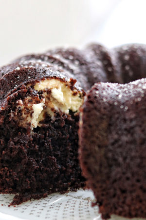 I love the contrast in textures and flavors in this cake. A rich chocolate bundt paired with a smooth and creamy cream cheese filling is a match made in heaven!