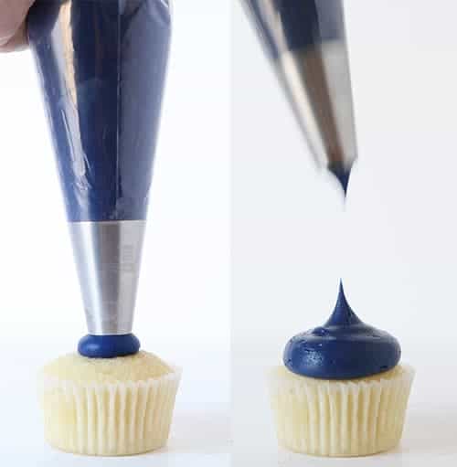 Holding bag directly above cupcake start to apply pressure. Do not move bag up, keep at steady and apply more pressure, letting the frosting fill out around the cupcake. When you have reached the desired size of dollop, release pressure and lift up.