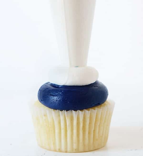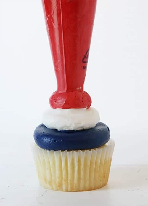The perfect Hi-Hat cupcake starts with perfectly placed buttercream. (Remember, if you do not want it Patriotic, you can simply use plain buttercream. All the techniques are still the same.)