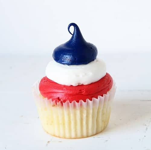To make the red, white and blue colors inside the cupcake, prepare one batch of frosting. I recommend this Basic Buttercream, but use an imitation clear vanilla extract to help frosting stay white.