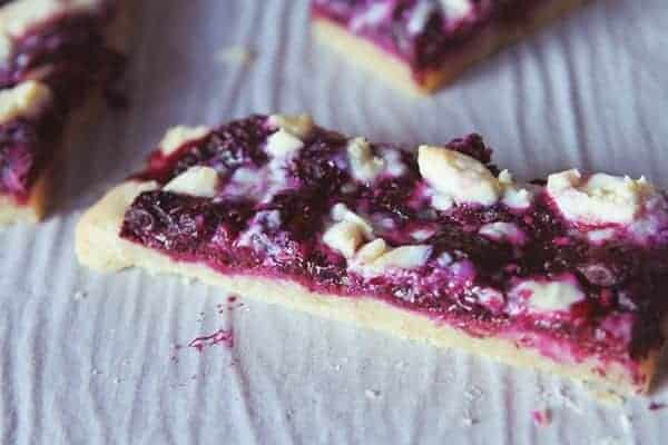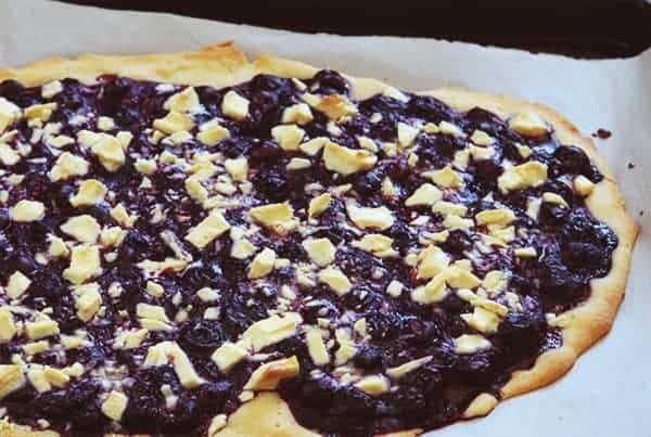 • Pour blueberry sauce over tart and allow it to get right to the edges. Place tart back into oven for 8 minutes. (This is where the indention and groves your fingers made in the dough help, as they are natural divets for the sauce to sink into)